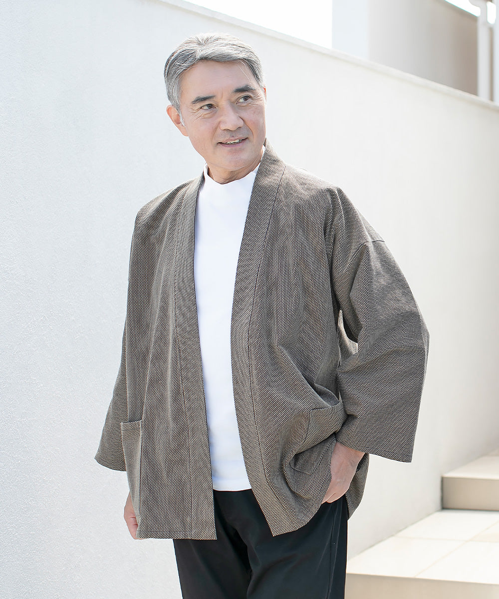The moderately thick fabric is light enough to be easily worn in the chilly season. The regular Sashiko-ori pattern gives it a slight sheen. Please use it as a companion for going out and relaxing in comfort.