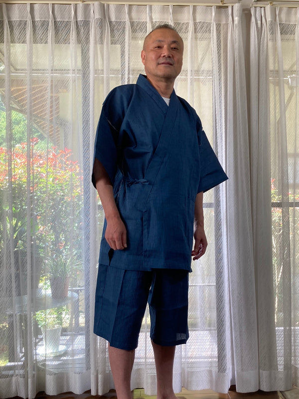 "Yoryu," meaning “willow,” is a type of woven fabric where the crepe on the surface of the fabric, called "shibo," looks like willow leaves swaying in the wind. These shibo are produced by applying a strong twist only to the weft yarns. In addition to its fashionable look, it is durable, wrinkle-resistant, sweat-absorbent, and quick-drying. The look of willow leaves has a unique beauty and creates a sophisticated atmosphere. The threads connecting the sleeves to the body of the jinbei are hand-made by Japanese artisans in the traditional way.