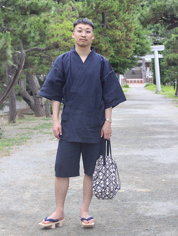 Each Jinbei consists of a yukata-like jacket and knee-length pants. Originally, they were worn at Japanese summer festivals in place of yukata. These days, they are popularly worn at home as loungewear or nightwear.