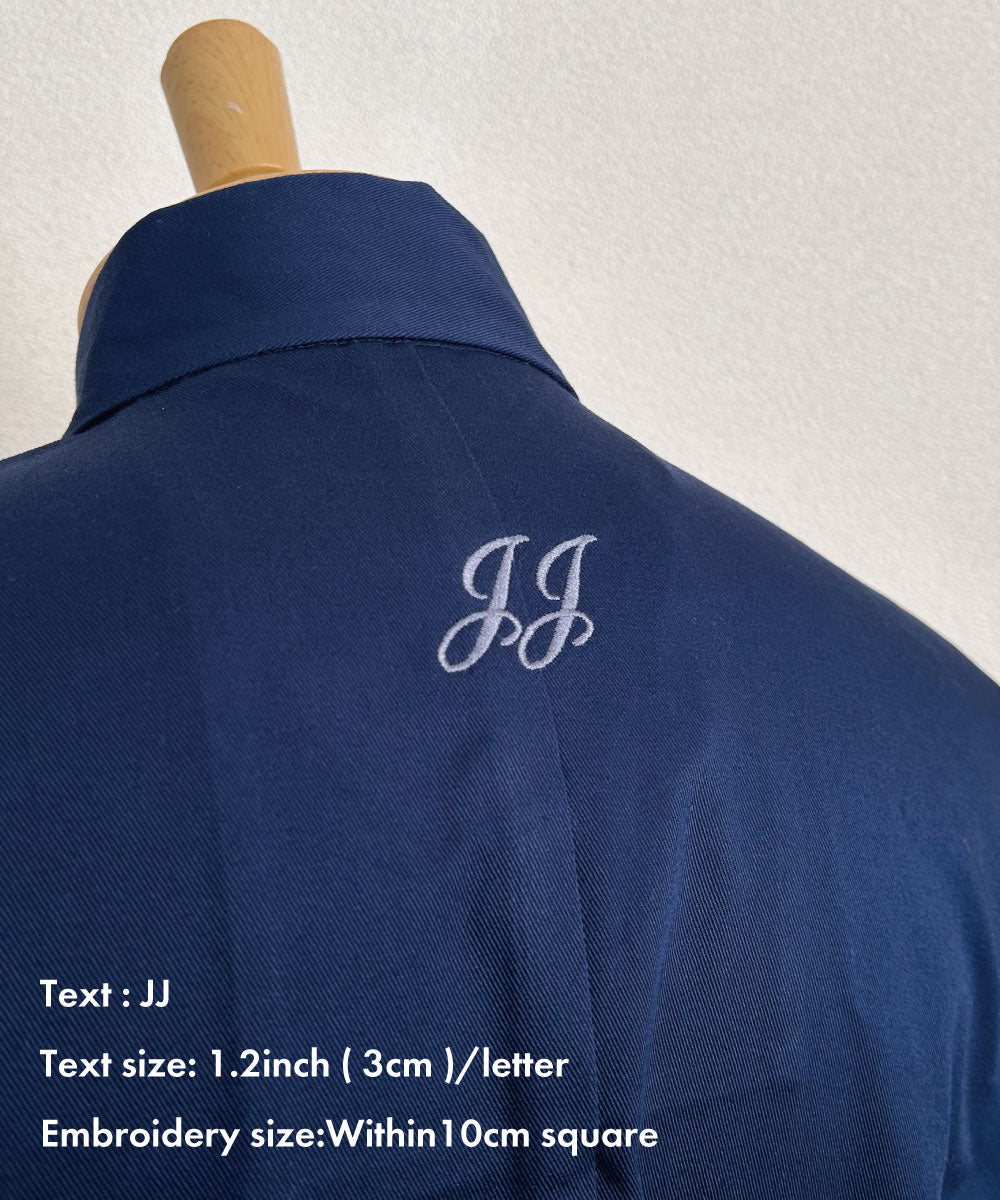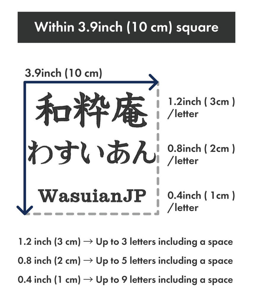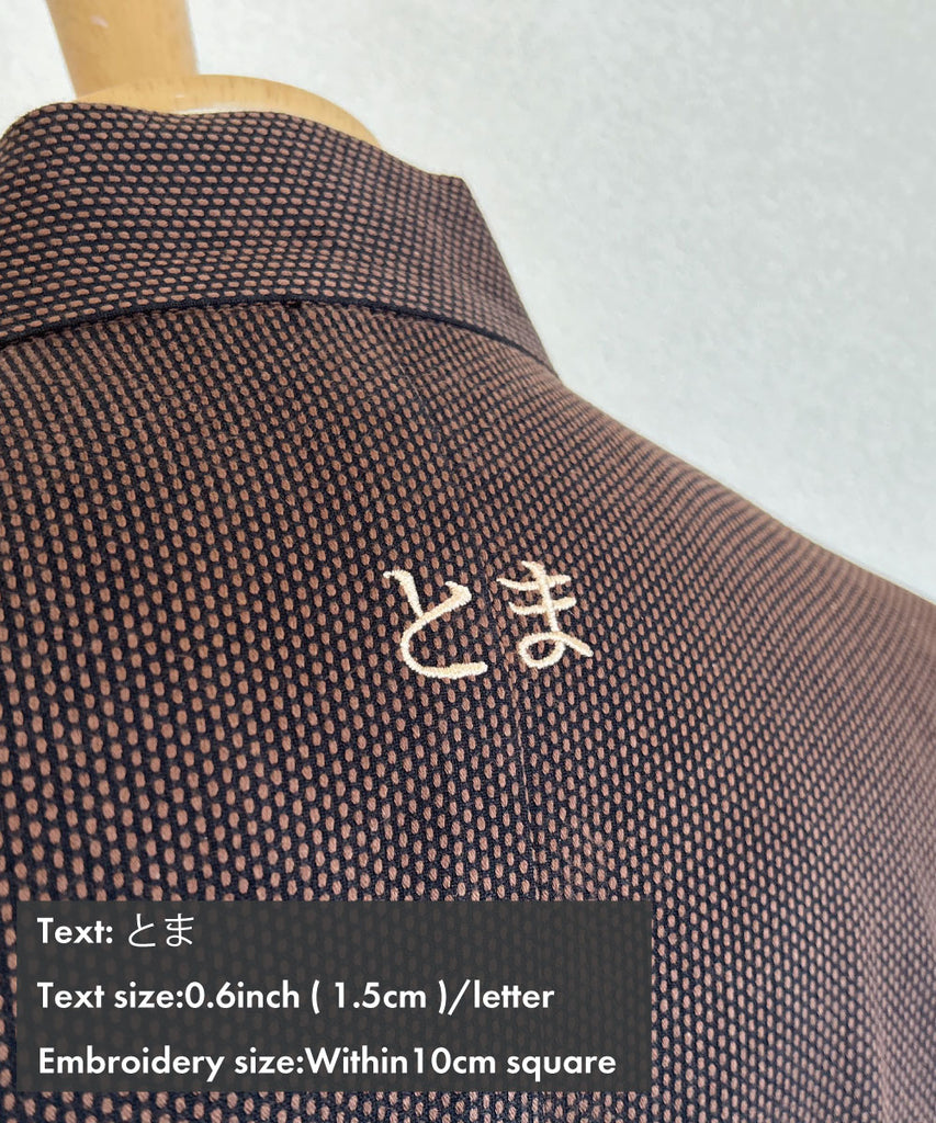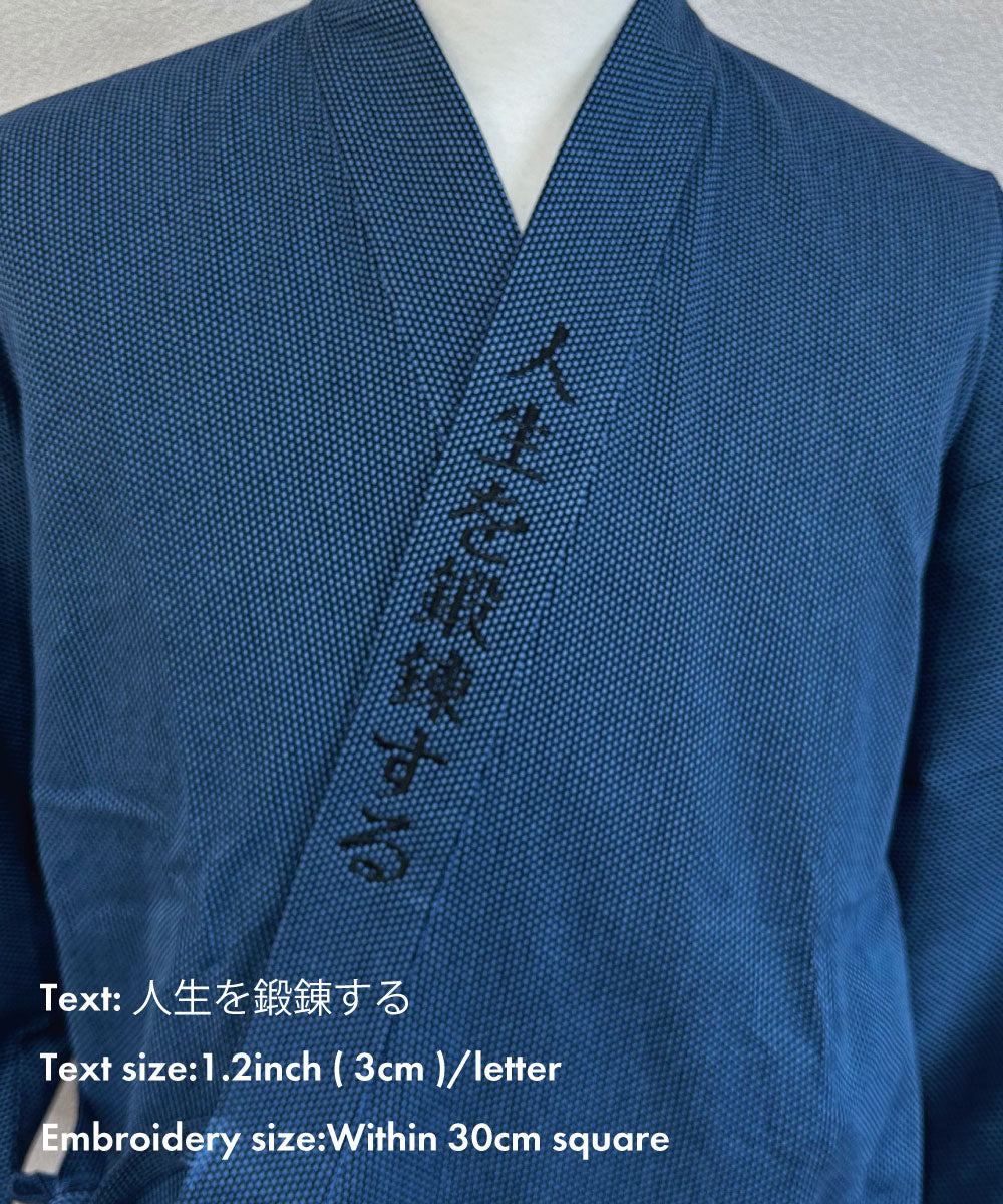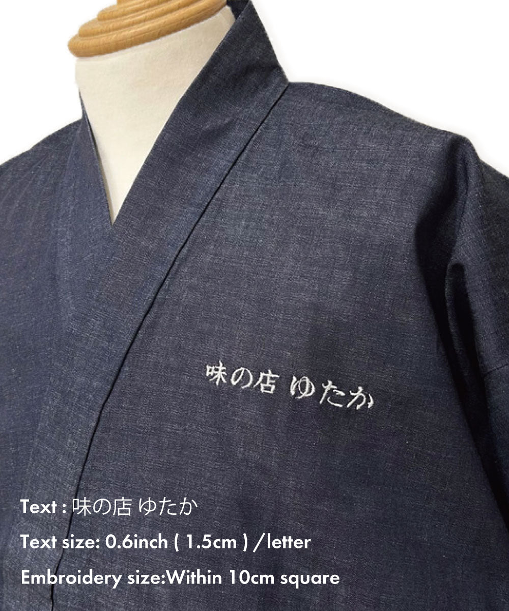 You can make your special embroidery on our samue or jinbei here at Wasuian! There are a variety of choices for the characters, the place, the font, the thread colors, and the size of the embroidery within a 10 cm square. You can just simply put your name or a famous proverb, quote, or four-kanji idiom.